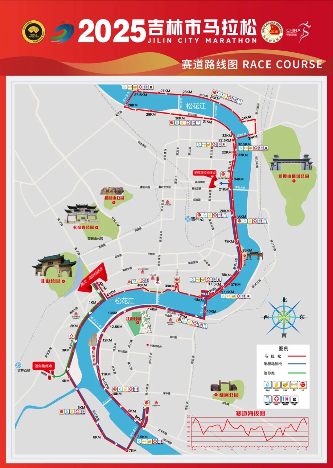 (一)马拉松:人民广场(起点)→越山路→(右转)松江中路→松江西路→松江南路→(左转)江城大桥→(折返)吉林大街→(右转)滨江西路→滨江东路→(左转)江湾大桥→(左转)松江东路→(右转)龙潭大桥→(左转)龙潭大街→(左转)滨江北路→(左转)哈龙大桥→(左转)松江北路→松江东路→(右转)天津街(折返)→(右转)松江东路→(左转)松江中路(下穿吉林大桥)→(左转)松江中路→(右转)越山路→人民广场(终点)