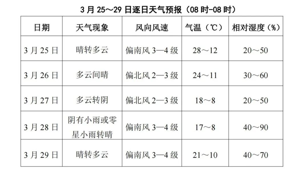 2026年3月24日17时发布,预计 3 月 25~29 日,我市天气以晴到多云为主,其中 28 日白天阴有小雨或零星小雨。25~29 日最低气温 8~12℃,最高气温 17~28℃。