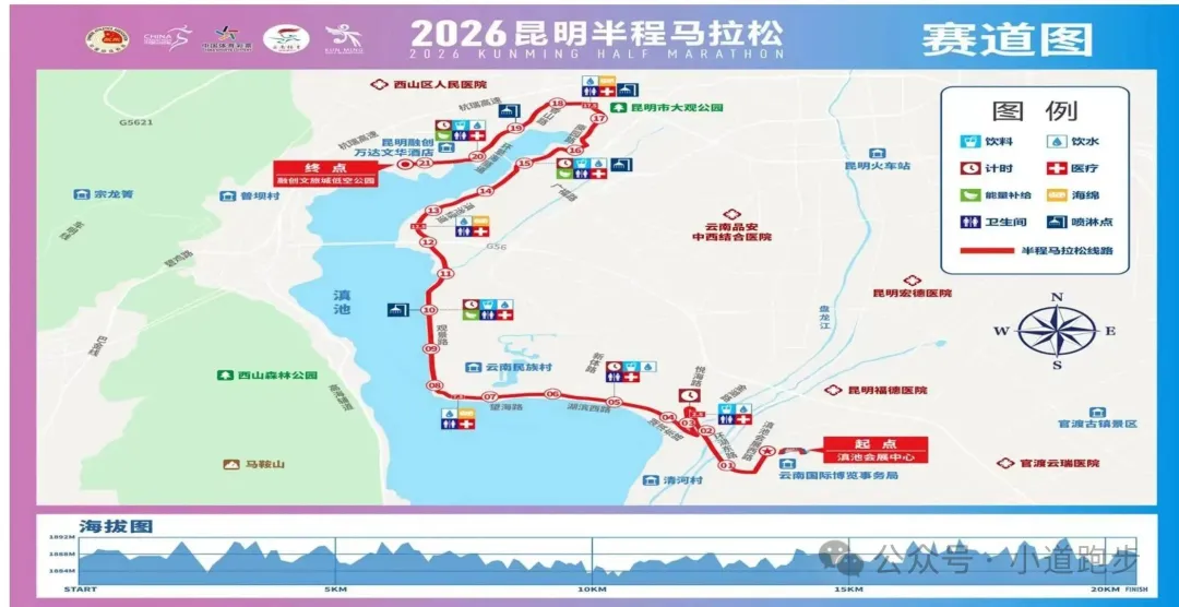 半程马拉松(21.0975km) :起点同为国际会议展览中心北广场,向北行至观山东路折返,经由黔灵山路、金阳南路、金阳北路、石林东路,再经过北京东路、云潭北路,最终回到起点处。