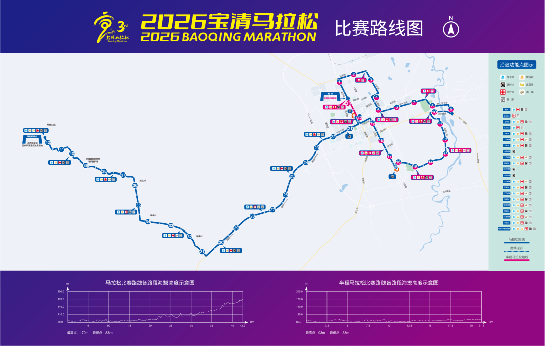 从起点(文化创意中心)出发-新华路往北-右转站前街往东-右转东升路往南-右转友谊街往西-左转幸福路(西侧)往南-左转中央大街往东-游乐园-挠力河北桥往东-右转振兴路往南-右转挠力河南桥往西-左转双拥大坝往南-右转双拥大坝往西-左转人民路往南-折返-人民路往北-左转中央大街往西-右转新华路往北-折返新华路往南-右转中央大街往西-G229往西-右转梨南村-梨中村-梨北村-梨树林场管护站-穿越知青小镇–终点(圣洁摇篮山国家级滑雪旅游度假地),共42.195公里。