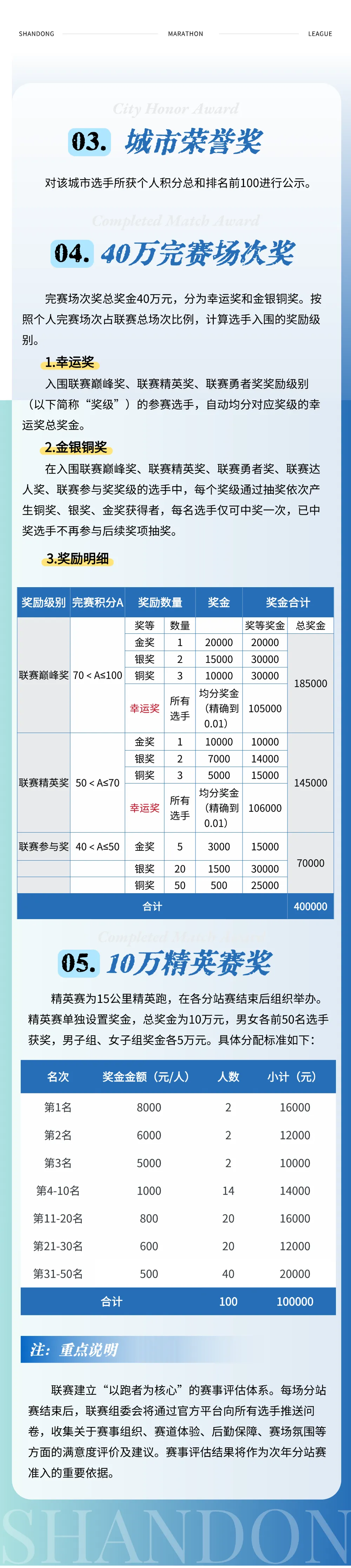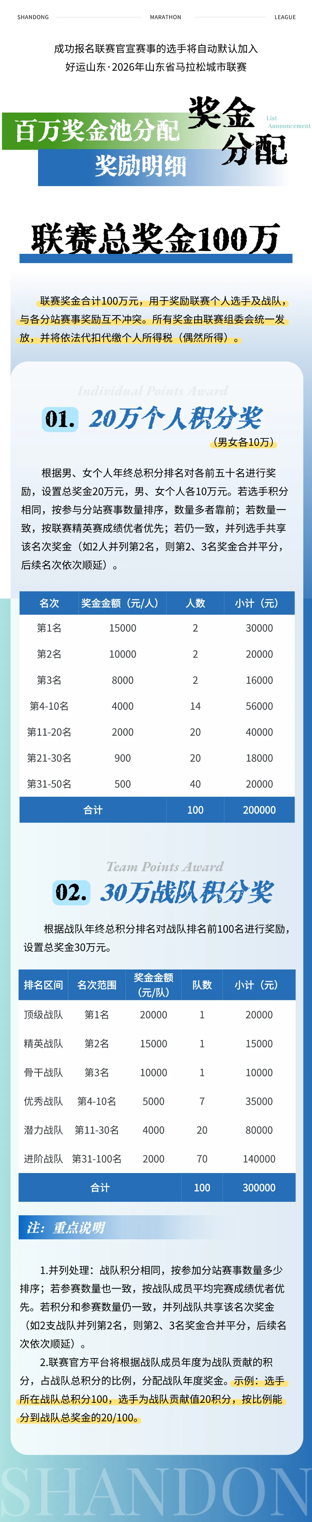 1. 个人年度积分奖励总额二十万,分男女组别单独排名奖励,各占十万元。年终按总积分高低排序发放,积分相同时,优先对比参赛场次,场次多者靠前;场次一致则参考精英赛成绩;依旧持平就并列平分对应奖金。