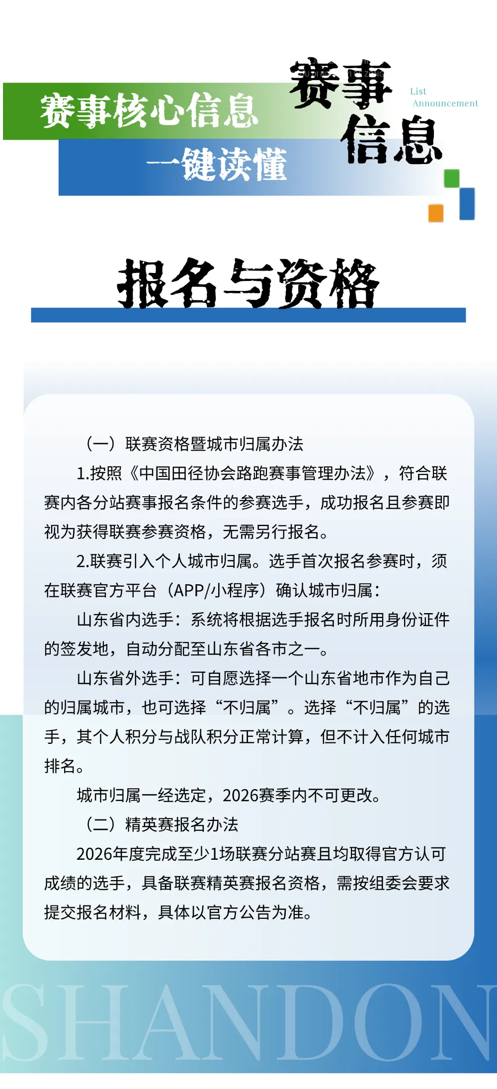 只要成功报名并完成任意一站联赛赛事,就自动获得联赛参赛资格,无需单独额外报名。省内选手以身份证签发地自动锁定所属城市;省外选手可自主选择一个山东地市挂靠,也可以选择不归属城市,不归属不影响个人和战队积分,只是不计入城市排名。城市归属一旦确定,整个 2026 赛季不能更改。想要参加精英赛,需要当年至少完赛一场联赛分站赛,拿到有效成绩才有报名资格。
