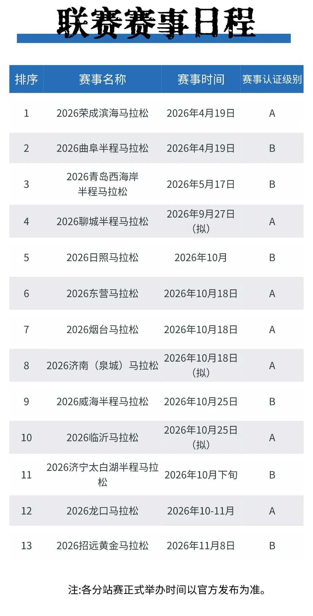 2026山东马拉松联赛启幕!联赛时间4月-12月,其中包括赛事13场!其中三场赛事定档10月18日和北京马拉松撞期!