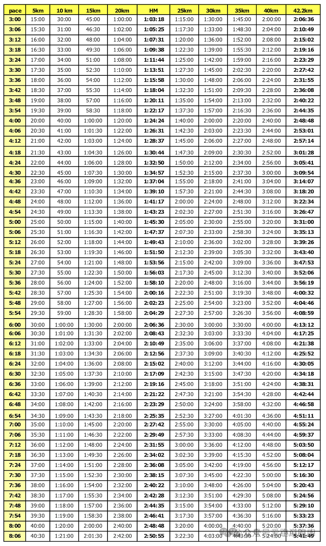– 前5公里配速比目标慢5秒/公里,作为热身缓冲;
