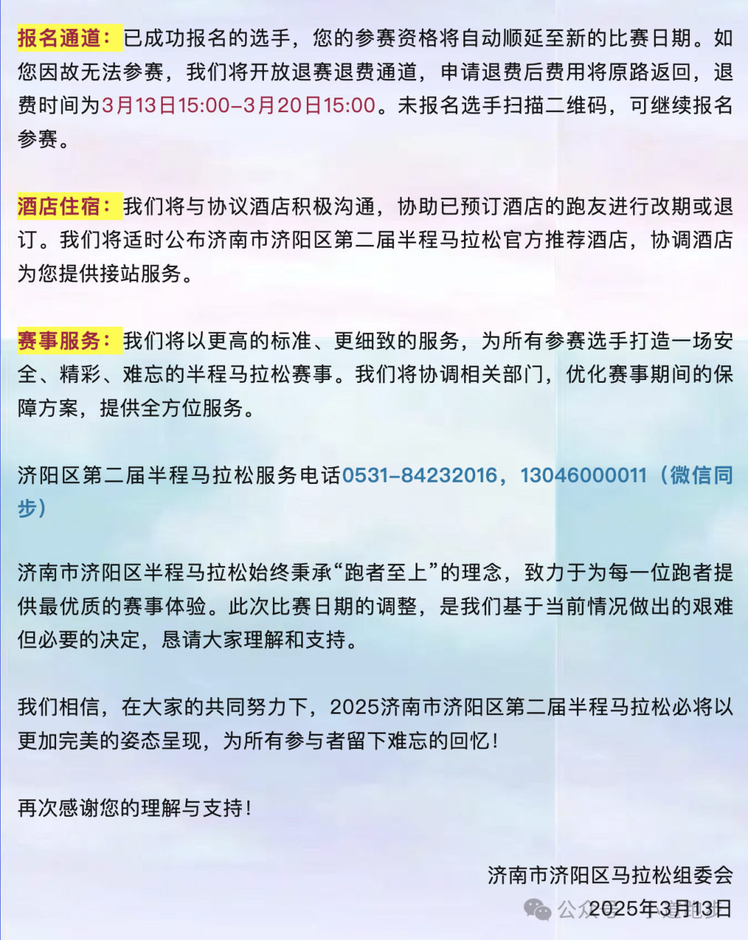济阳区第二届半程马拉松原定于2025年5月1日举办。将延期到5月11日举办!退费时间为3月13日–3月20日!更多信息查看原文链接!