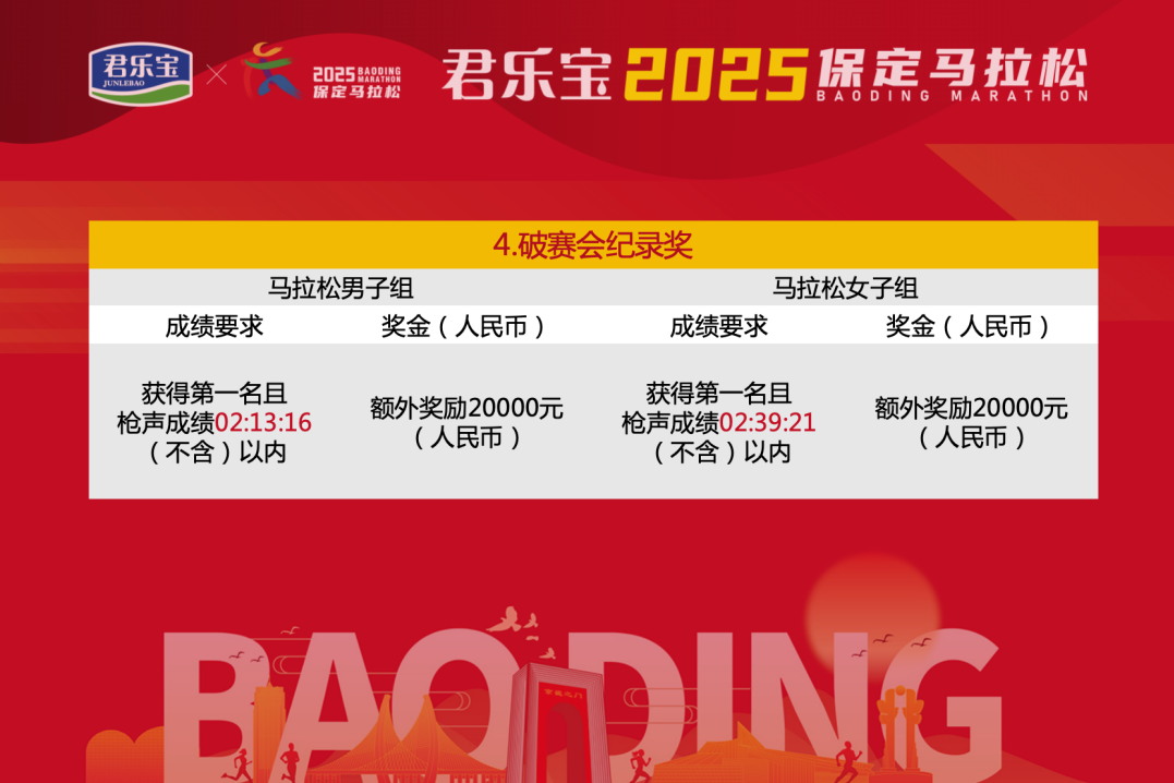 君乐宝2025保定马拉松赛事规模扩增至25000人,其中马拉松项目6000人,半程马拉松项目11000人,欢乐跑项目8000人(含1000组家庭组)。