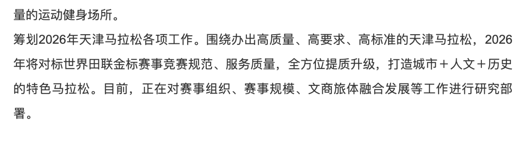 筹划2026年天津马拉松各项工作。围绕办出高质量、高要求、高标准的天津马拉松,2026年将对标世界田联金标赛事竞赛规范、服务质量,全方位提质升级,打造城市+人文+历史的特色马拉松。目前,正在对赛事组织、赛事规模、文商旅体融合发展等工作进行研究部署。