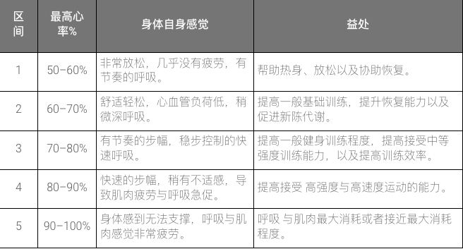根据最大心率,可以将运动强度分为五个心率区间,分别是: