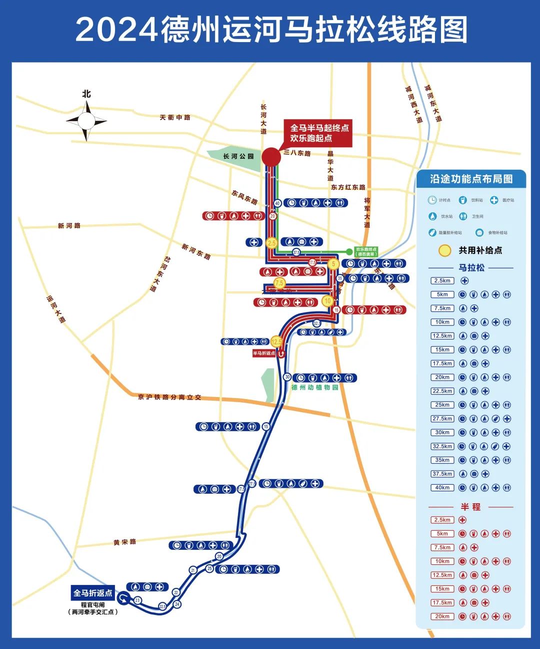 1.马拉松路线体育公园西门(长河大道)→在长河大道西幅道路集结 ,鸣枪后往南行进,至新河东路左转 →进入新河东路,沿新河东路往东,行进至晶华大道右转 →进入晶华大道,沿晶华大道西幅往南行进 → 右转进入太阳湖路 → 沿太阳湖路北幅行进至长河大道路口,掉头进入太阳湖路南幅,沿太阳湖路前进 →右转进入晶华大道 → 沿晶华大道行至减河西大道 → 沿减河西大道前行至黄河涯村头大桥左转上桥 → 过桥后右转进入减河东大道 → 沿减河东大道行至程官屯闸(两河牵手交汇处)折返 → 沿减河东大道前行至黄河涯村头大桥左转上桥 → 过桥后右转进入减河西大道 → 沿减河西大道行至晶华大道东幅 → 行至新河东路左转 → 沿新河东路北幅行至长河大道右转 →进入长河大道西幅 →体育公园西门(终点)