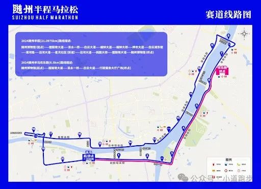 赛道与文化 赛道设计:起点为随州市博物馆,半程马拉松终点也设在随州市博物馆,形成闭环;欢乐跑终点设在行政服务大厅广场。赛道沿涢水河畔蜿蜒前行,途经白云公园、乐都旋风广场、编钟大桥、滨湖八景、桃园大桥等地标建筑。 文化元素:赛事以“神韵随州 一见钟情”为主题,完赛奖牌融合了随州的编钟和古银杏群落元素,展现了随州深厚的历史文化底蕴。