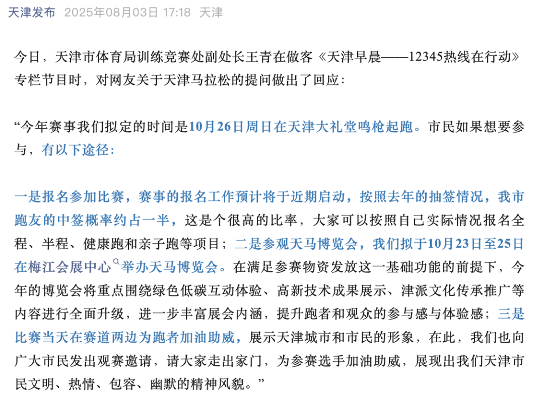 天津广播电视台近日播出的《百姓问政》栏目,聚焦市体育局承担的民心工程项目。其中,在提到今年马拉松赛事筹备相关工作时,市体育局训练竞赛处副处长王杰表示: