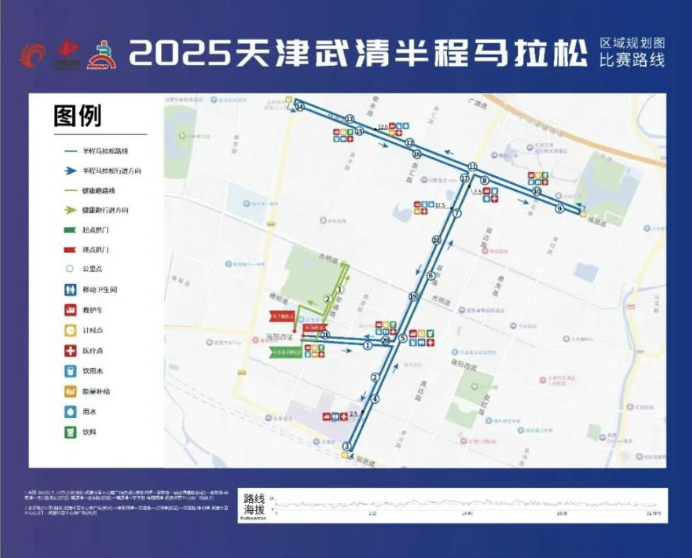 半程马拉松(21.0975公里):武清体育中心南广场(起点)→(直行)雍阳西道→(右转)翠亨路→前进道辅路(折返)→(直行)翠亨路→(右转)福源道→泉兴路口(折返)→(直行)福源道→南东路口(折返)→(右转)翠亨路→(右转)雍阳西道—武清体育中心南广场(终点)