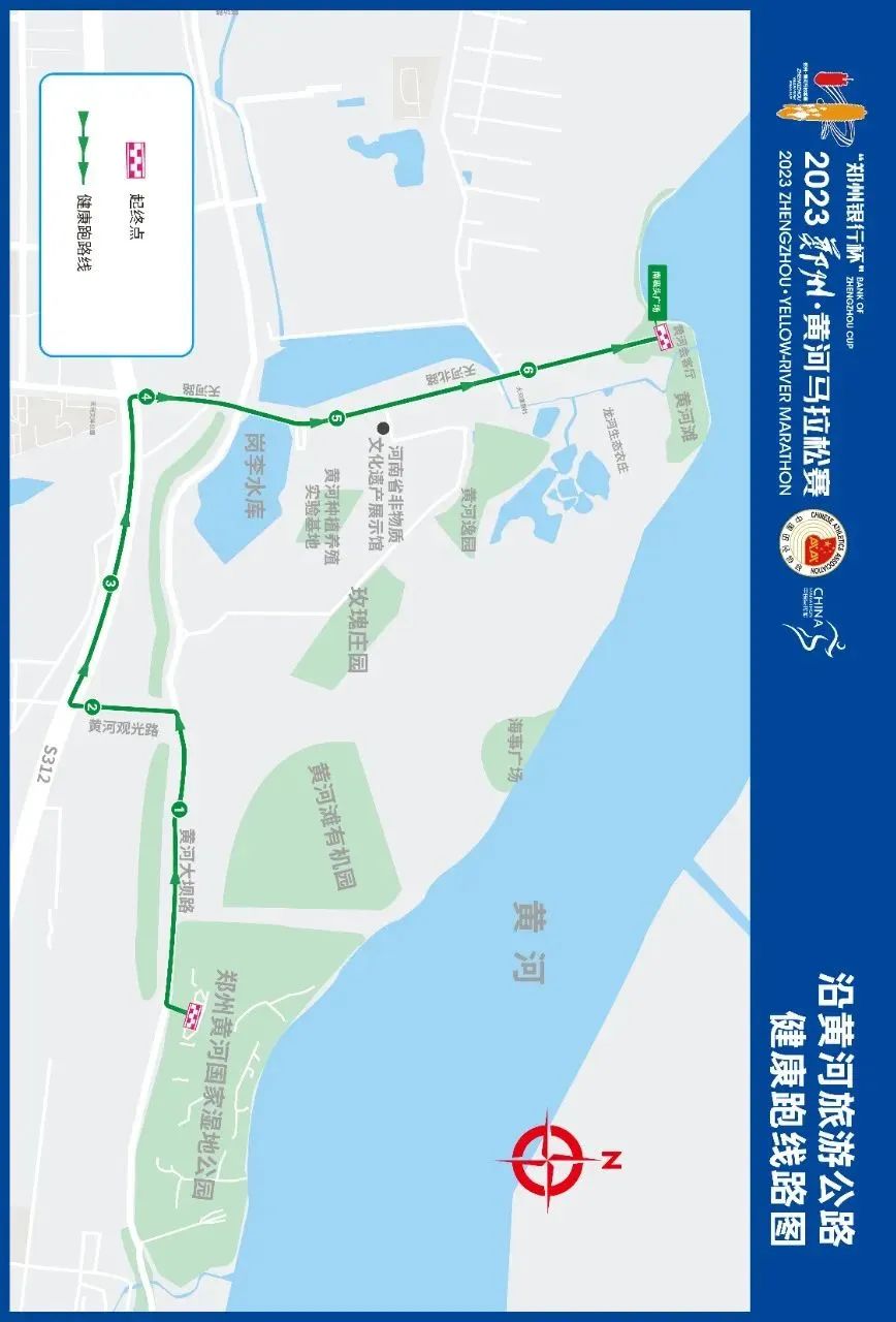(四)沿黄河旅游公路健康跑赛道。起点设在郑州黄河国家湿地公园——黄河大坝路——黄河观光路——S312——天河路——天河北路——至南裹头广场终点。
