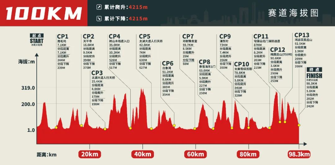 100KM路线串联起穹窿山、灵岩山、大阳山、天池山、五峰山、光福群山等苏州代表性山峰,可以让跑者们在一次比赛中尽览苏州山野精华。作为本次赛事最具挑战性的组别,超长距离+横跨昼夜的赛程设计对选手的体能、耐力和越野经验都提出了极高要求。