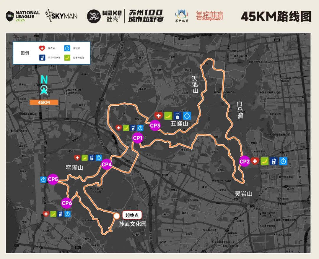 赛道穿越苏州的经典风景名胜,如孙子兵法博物馆、穹窿山、灵岩山、龙池风景区等。45KM的距离对选手的耐力和体能有一定要求,适合有一定越野基础或马拉松经验的跑者。