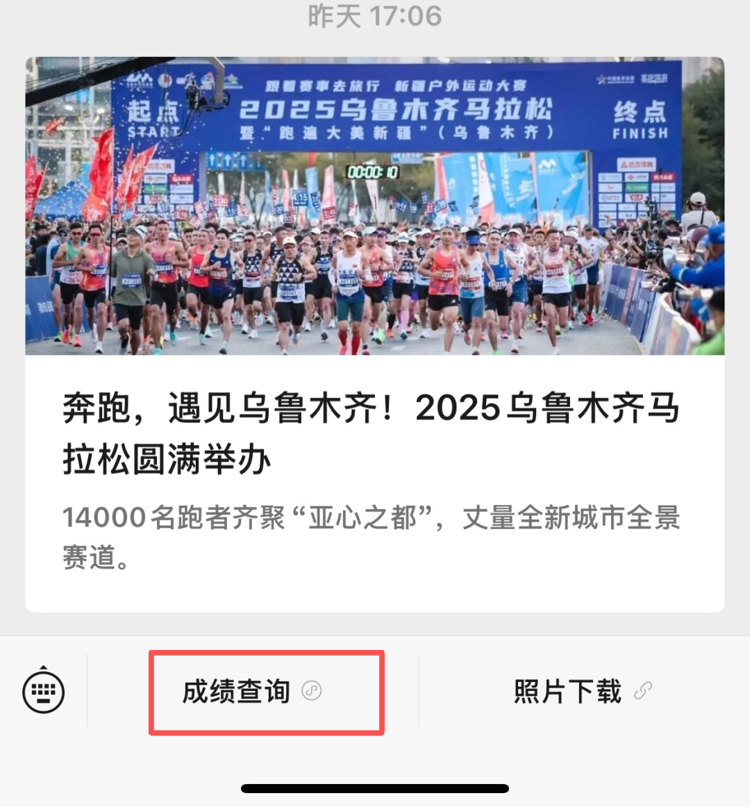 2.点击菜单栏的“成绩查询”,进入小程序后选择“2025乌鲁木齐马拉松”