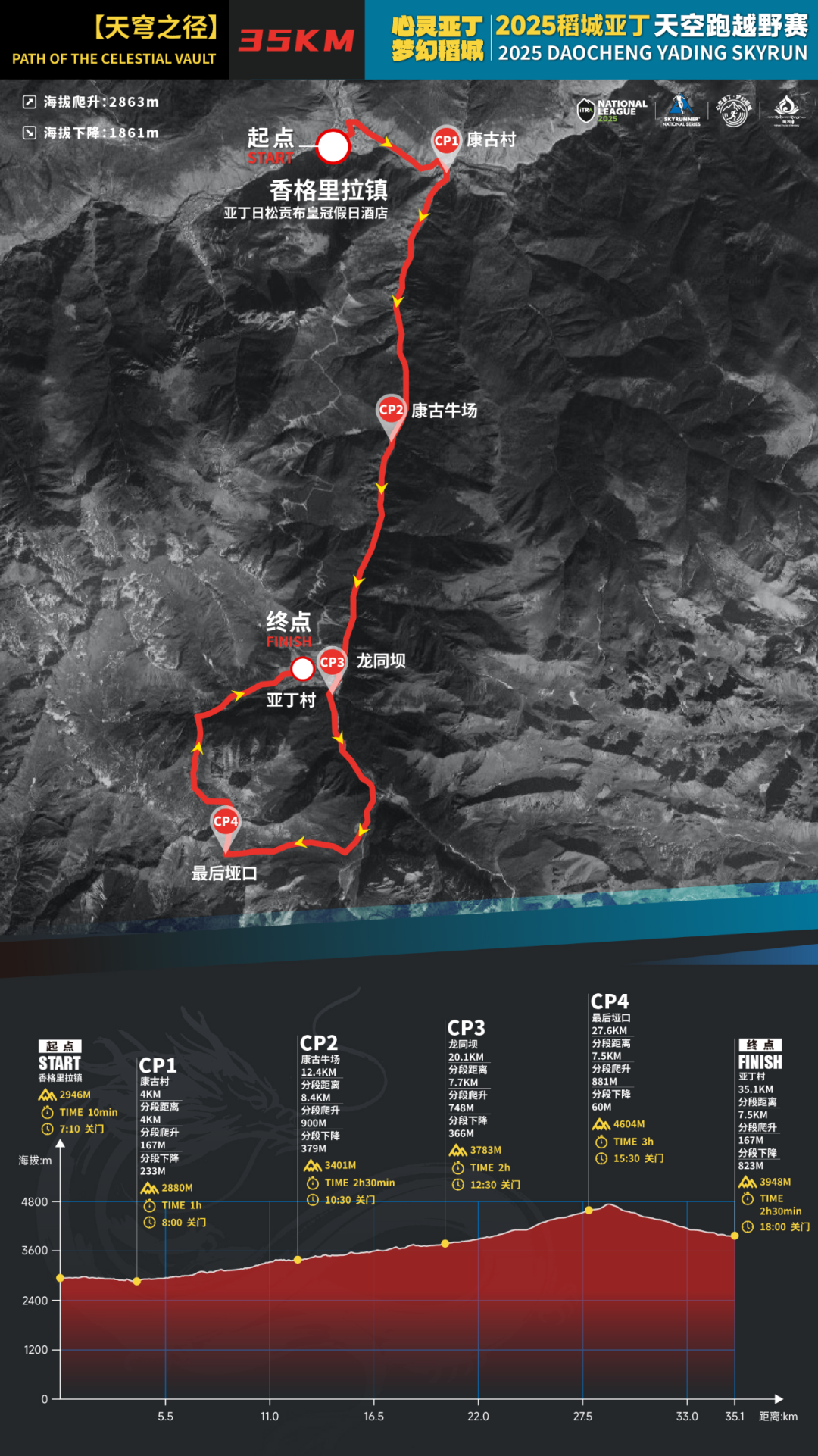 「天穹之径」35公里组别  累计爬升2863m,累计下降1861m。参赛选手从香格里拉镇出发,一路经过康古村、康古牛场、龙同坝、冲古寺、珍珠海、最后垭口,最终抵达亚丁村。