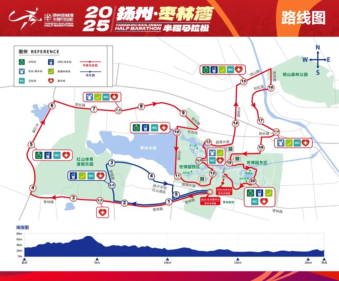 2025扬州枣林湾半程马拉松打造沉浸式园林赛道,串联扬州世博园、铜山森林公园、枣林水库、红山体育度假乐园等地标,每一步都有惊喜,21.0975公里全程宛如穿行 “自然博物馆 + 文化长廊”。