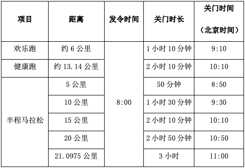 为了保证参赛选手比赛安全、顺利,比赛期间比赛路线各段实行限时交通封闭,关门时间到后,相应路段将逐段恢复开放社会交通。参赛选手在规定的关门时间内,未跑完对应的距离者须立即停止比赛,退出赛道,以免发生危险。退出比赛的选手可乘坐组委会提供的赛事援助车到终点处,关门时间以枪声成绩为准,各项目关门时间见下表:
