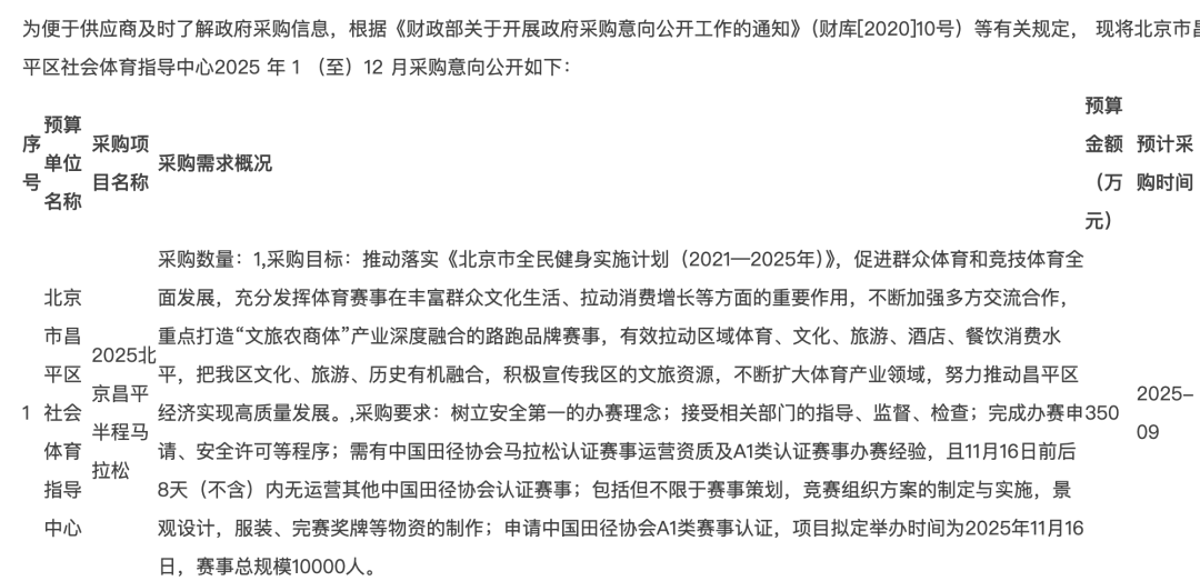 具体招标信息如下:需有中国田径协会马拉松认证赛事运营资质及A1类认证赛事办赛经验,且11月16日前后8天(不含)内无运营其他中国田径协会认证赛事;包括但不限于赛事策划,竞赛组织方案的制定与实施,景观设计,服装、完赛奖牌等物资的制作;申请中国田径协会A1类赛事认证,项目拟定举办时间为2025年11月16日,赛事总规模10000人!