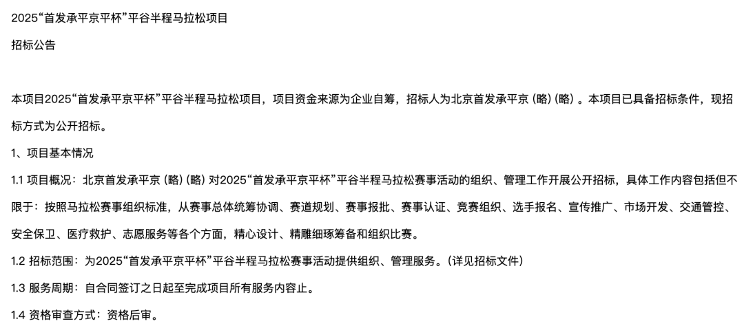 本项目2025“首发承平京平杯”平谷半程马拉松项目,项目资金来源为企业自筹,招标人为北京首发承平京 本项目已具备招标条件,现招标方式为公开招标。