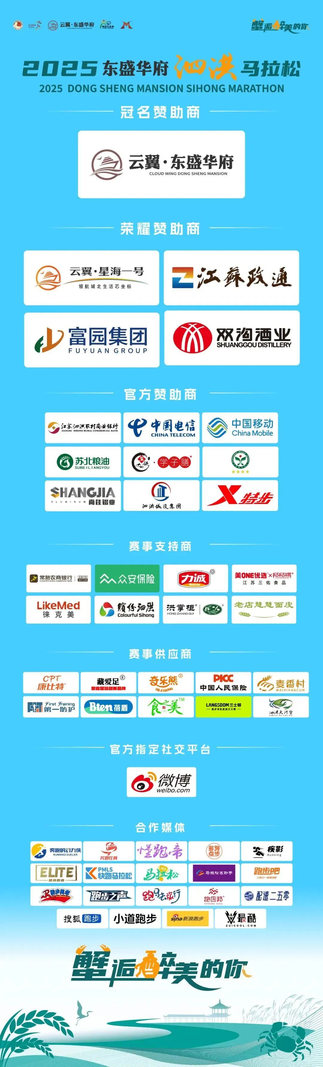 此外,感谢所有参与赛事直播、摄影与报道的媒体朋友,以及泗马的合作伙伴们:云翼·东盛华府、云翼·星海一号、江苏政通、富园集团、双沟酒业、江苏泗洪农村商业银行、苏北粮油、洪翔中学、众安保险、力诚、徕克美、康比特、藏爱足、中国人民保险、第一防护、蓓盾、兰士顿……是你们,共同成就了2025东盛华府泗洪马拉松的圆满时刻!