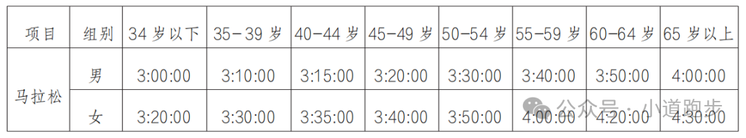(1)精英选手:根据中国田径协会发布的《中国田径协会路跑赛事大众选手等级评定实施办法》,2020年1月1日(含)至报名时在“中国马拉松”网站可查询到的、经中国田径协会认证为“A类赛事”的马拉松项目成绩数据里,成绩达到以下直通标准的选手通过信息审核后可获得参赛资格: