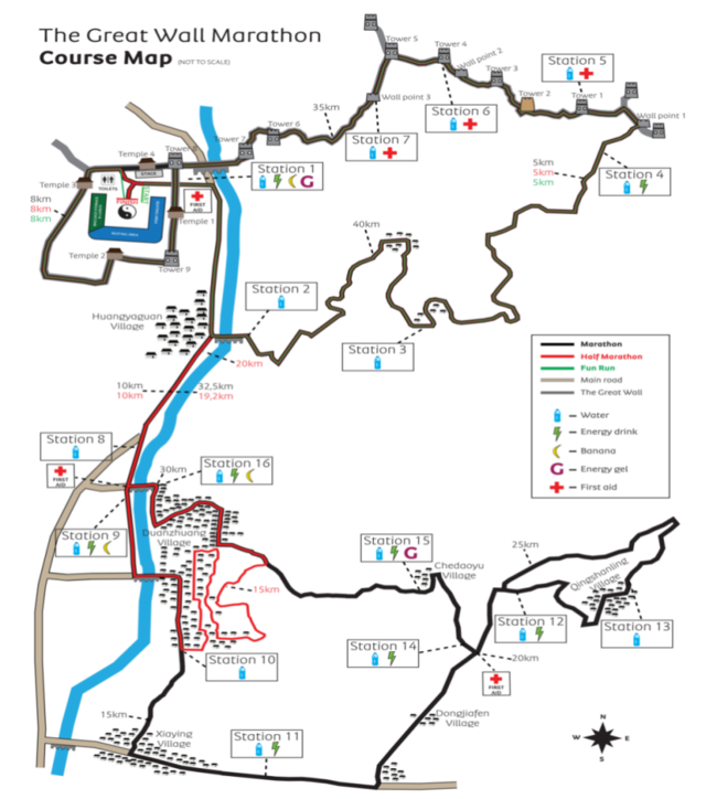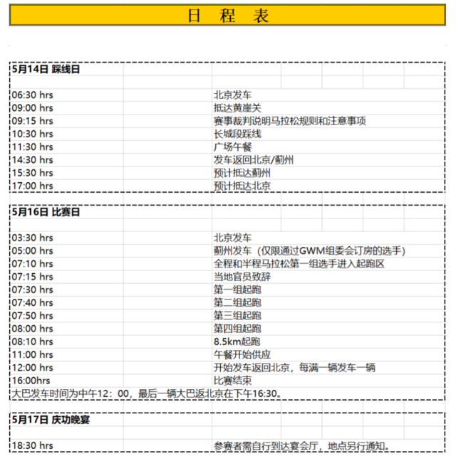 【1、5月14日北京集合点至天津黄崖关长城往返交通;2、广场说明会,裁判介绍比赛注意事项;3、乘车至太平寨进入长城踩线;4、计时和医疗咨询 (踩线日是更改跑步距离的最后机会);5、午餐(三明治,水果,水等)】