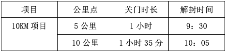 为了保证参赛选手比赛安全、顺利,比赛期间比赛路线各段实行限时交通封闭,关门时间到后,相应路段将逐段恢复开放社会交通。参赛选手在规定的关门时间内,未跑完对应的距离须立即停止比赛,退出赛道,以免发生危险。退出比赛的选手可乘坐组委会提供的收容车到终点处。各项目关门时间见下表(8:30鸣枪出发):