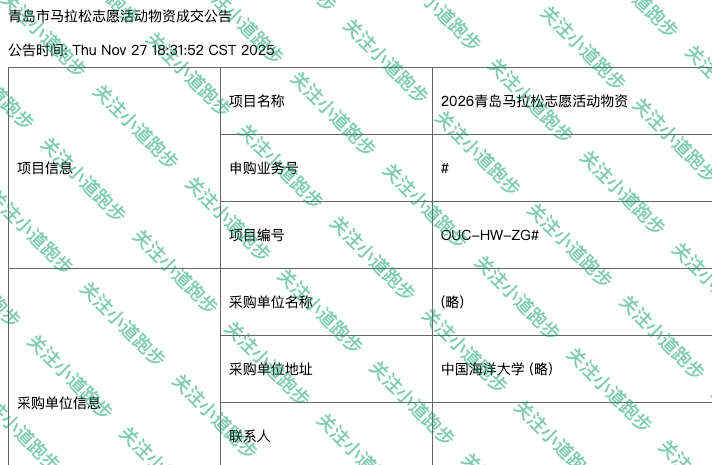根据相关网站信息2026青岛马拉松开始对志愿者进行招募,采购单位中国海阳大学对物资完成采购采购!这标志着青岛马拉松已经启动!更多2026青岛马拉松报名消息关注【小道跑步】公众号!