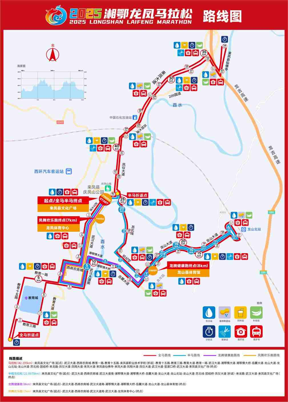 来凤县文化广场(起点)→武汉大道→西商农商城→武汉大道南→湘鄂情大道→湘鄂情大桥→岳麓大道→龙山大道→龙山北站→龙山大道→苏北线→团结桥→凤仪大道(折返)→来龙路→武汉大道→来凤县文化广场(终点)