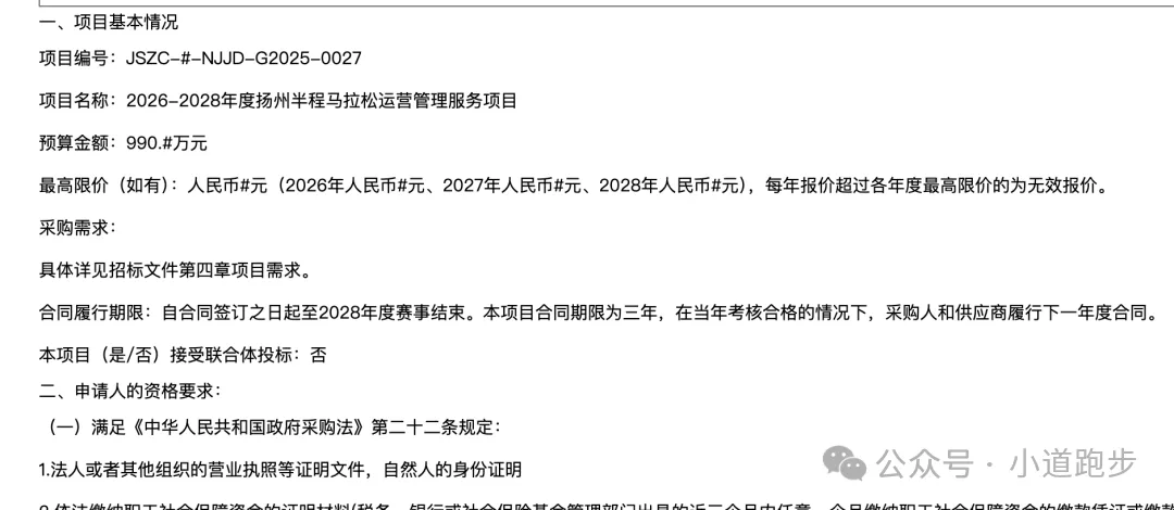 为确保顺利开展2026-2028年度扬州鉴真半程马拉松赛,扬州市体育局拟通过采购招标选择家供应商为2026-2028年度扬州鉴真半程马拉松赛提供相关赛事运营、管理等服务工作。服务时间共计叁年,合同每年一签。预算金额为人民币990万元,其中2026年预算金额为人民币350万元(包含“扬马”二十年活动组织策划和东亚半程马拉松费用),2027年预算金额为320万元,2028年预算金额为320万元,合同每年一签。