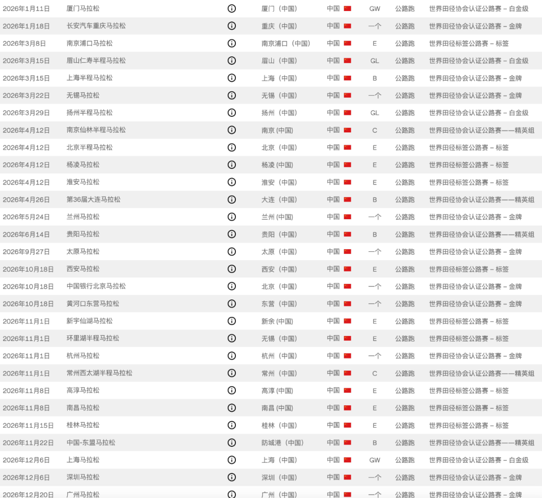 世界田联目前已经更新了一批2026年马拉松标牌、精英标、金标、白金标(部分)马拉松赛事举办时间!但是有些马拉松赛事尚未更新!已经更新的赛事举办时间如下: