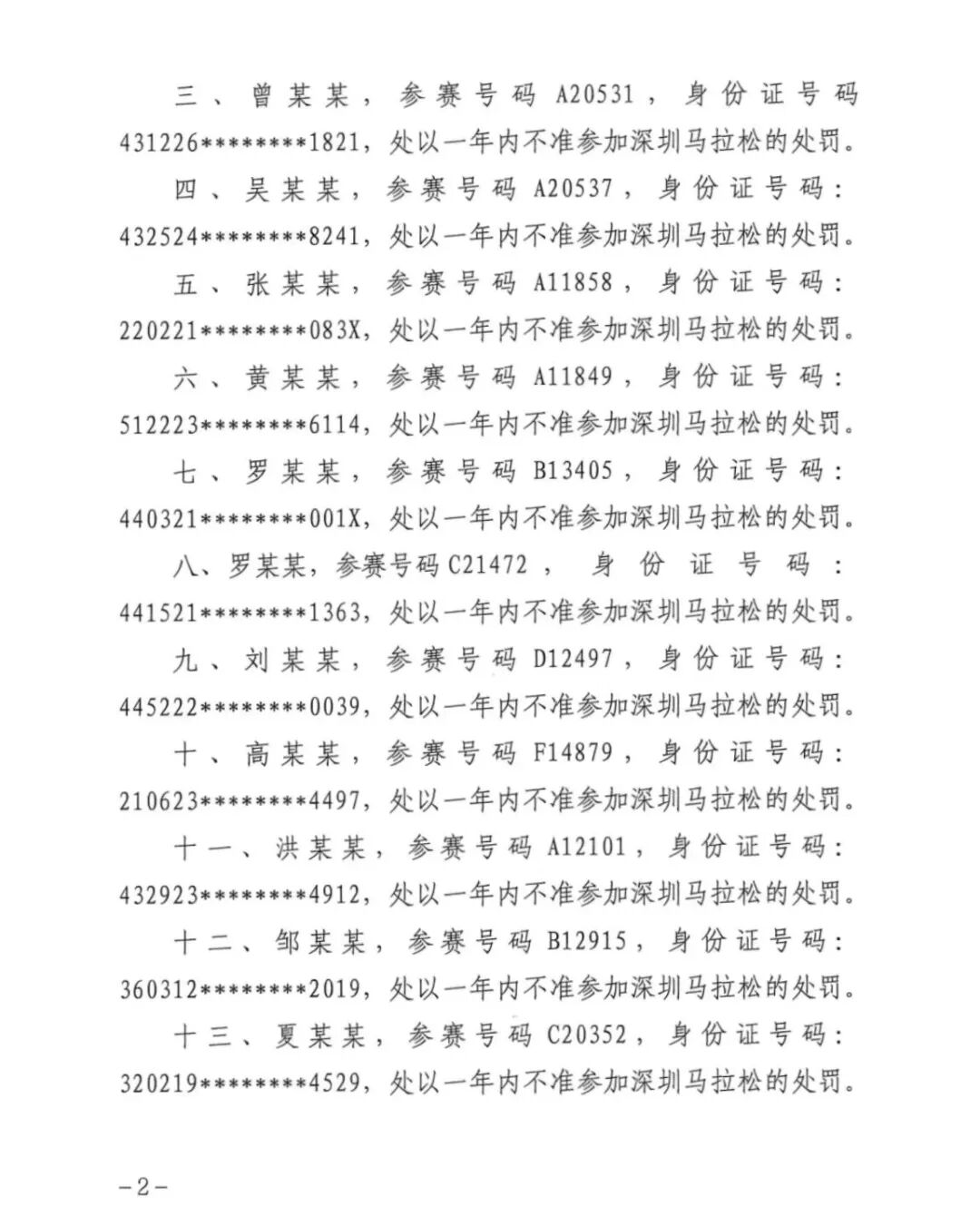 六、黄某某,参赛号码A11849,身份证号码:512223********6114,处以一年内不准参加深圳马拉松的处罚。
