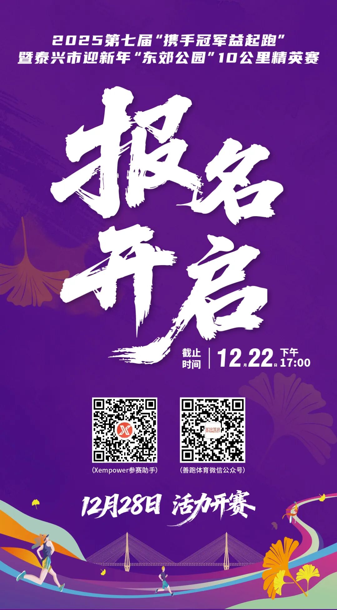 本次赛事将泰州“冠军之城”的体育基因融入奔跑的每一个瞬间。我们特邀奥运冠军与泰兴籍苏超冠军亲临现场,与你并肩开启新年第一跑。从起跑仪式的荣耀领航,到赛道途中的激情助威,再到终点线的荣耀见证,这将是一次与冠军运动员近距离互动、沉浸式感受奋斗精神的珍贵体验。