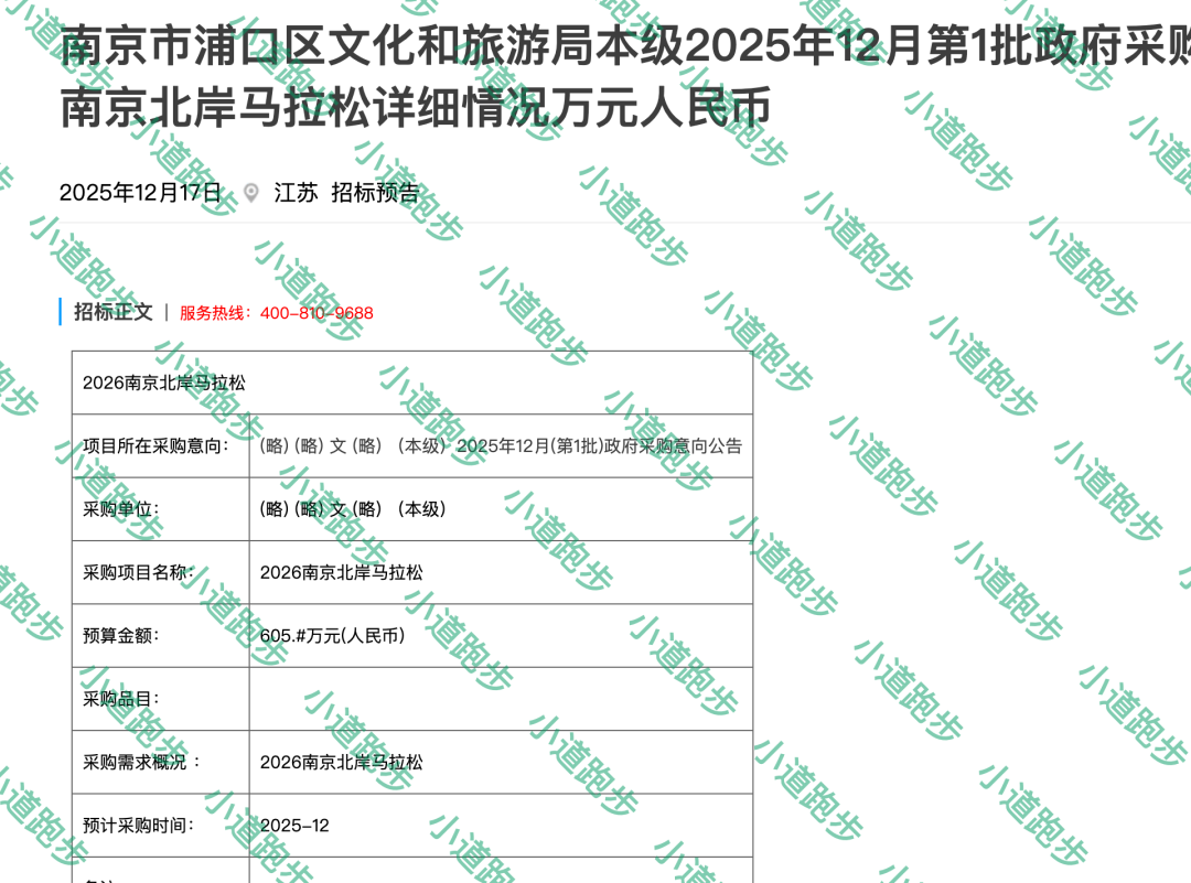 刚刚 2026南京浦口发布招标信息!对2026年南京北岸马拉松进行招标,金额605万!