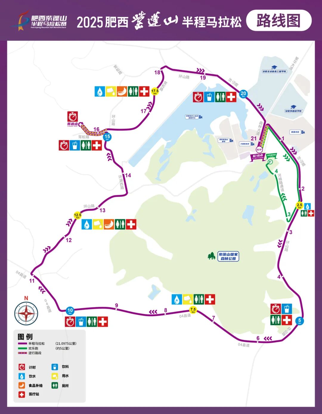紫蓬山山门广场(起点)→森林大道→环山路→04县道→环山路→环湖西路→常松路(折返)→环山路→森林大道→紫蓬山山门广场(终点)。