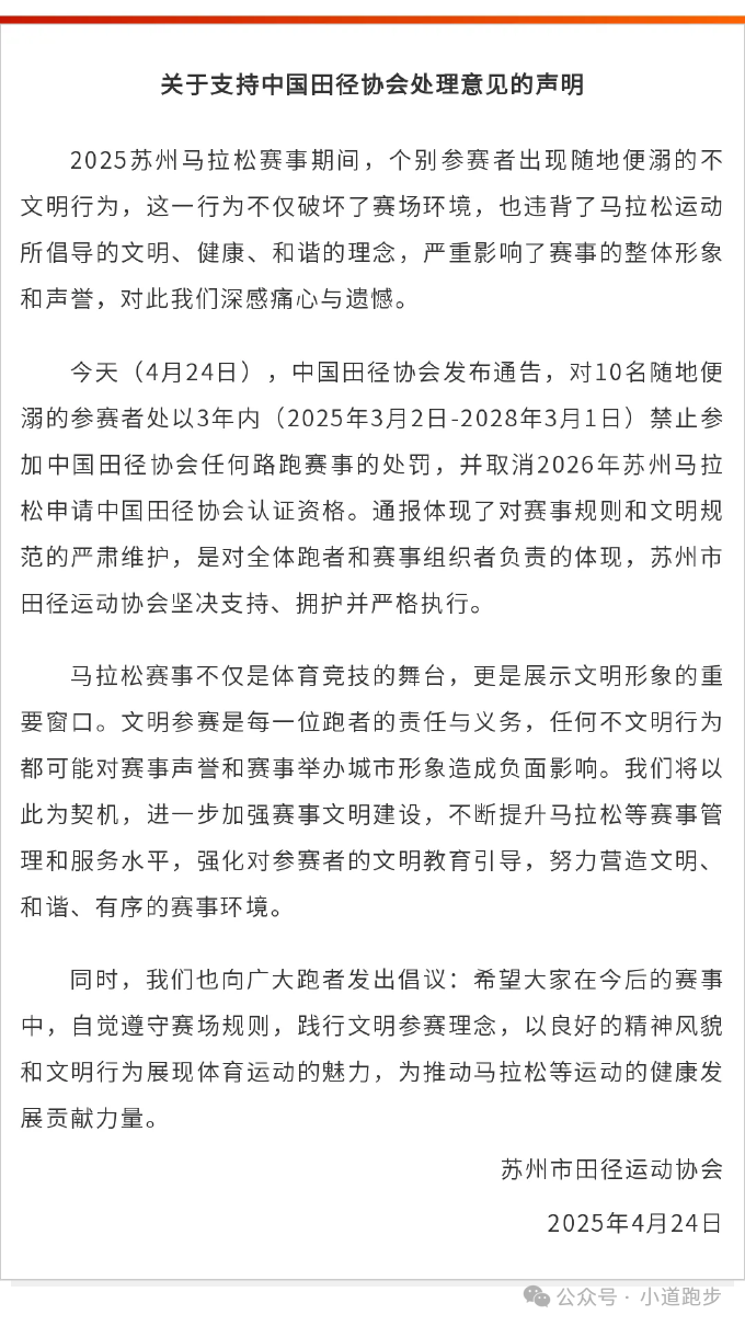 苏州市田径运动协会对此次事件表示痛心与遗憾,坚决支持中国田径协会的处理决定,并将以此为契机,加强赛事文明建设,提升赛事管理和服务水平,强化对参赛者的文明教育引导,努力营造文明、和谐、有序的赛事环境。