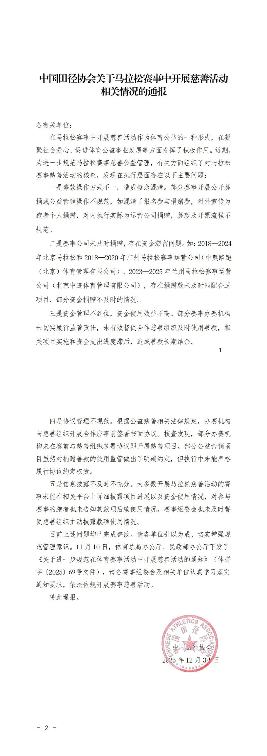 目前上述问题均已完成整改。请各单位引以戒、切实增强规范管理意识。11月10日,体育总局办公厅、民政部办公厅下发了《关于进一步规范在体育赛事活动中开展慈善活动的通知》(体群字(2025)69号文件),请各赛事组委会及相关单位认真学习落实通知要求,依法依规开展赛事慈善活动。