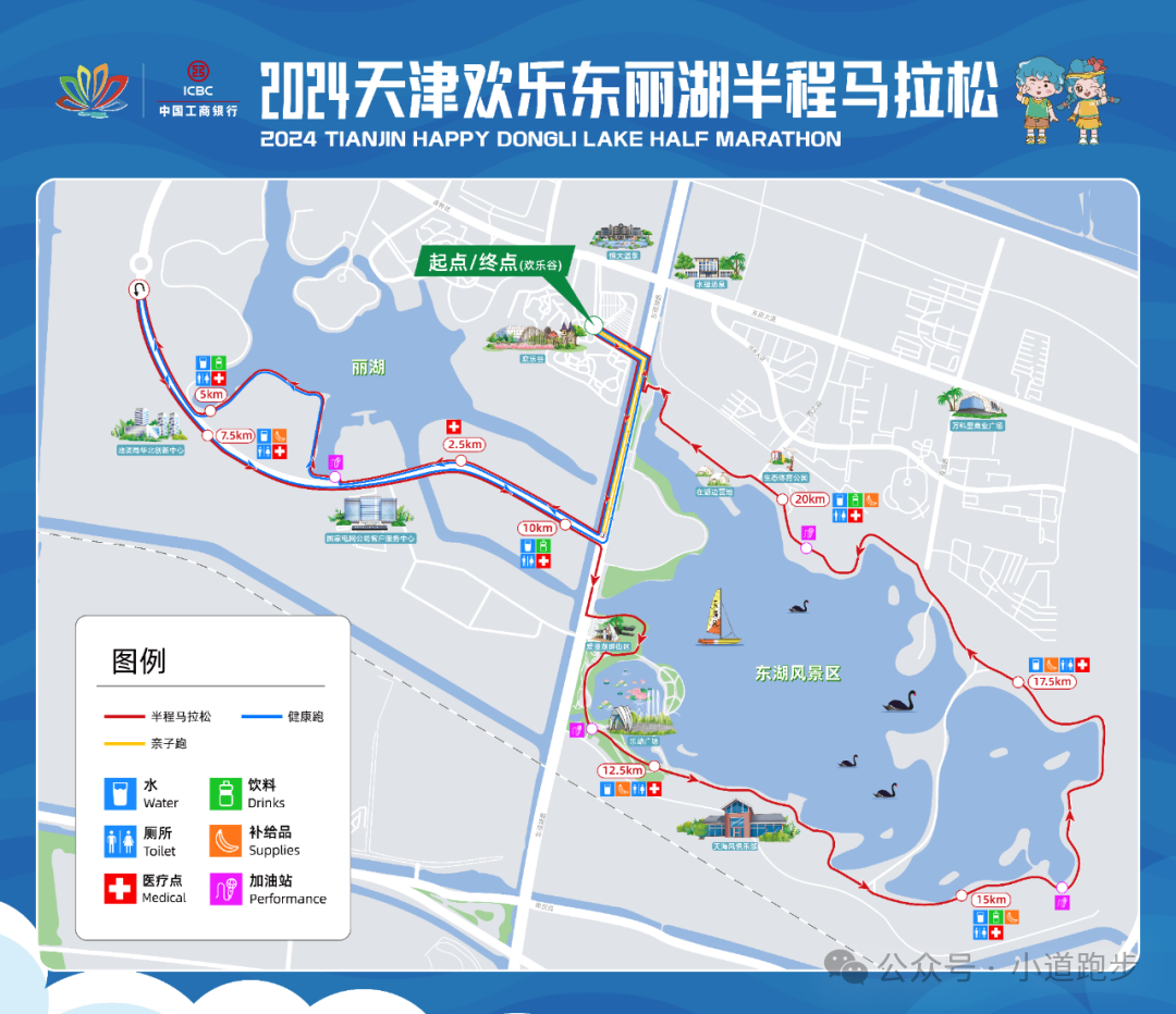 本次赛事的线路设计旨在让参赛者体验东丽湖的生态之美,赛事起点位于东丽区欢乐谷景区,这里是国家4A级景区,拥有丰富的游乐设施和主题节庆演艺。赛事线路贯穿东湖与丽湖,沿途经过多个景点,为参赛者提供了独特的自然风光和文化体验。 为了确保赛事的顺利进行,组委会提供了全面的服务保障,包括设置接驳路线、安排专车接送、配备医疗人员、安保人员和志愿者等。此外,赛事还为所有参赛选手提供参赛服、参赛包和景点优惠券,完成比赛的选手可获得完赛奖牌,而获奖选手则可获得奖金和特色玩偶湖东东、湖小丽。