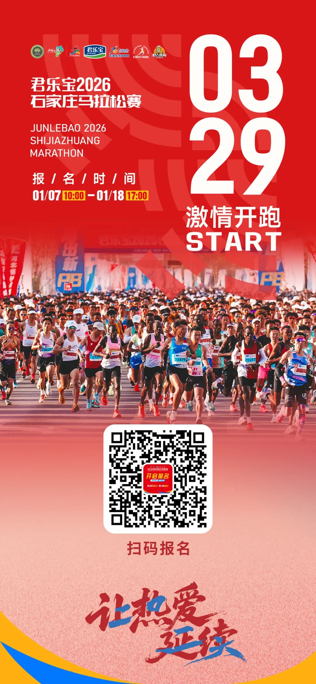 君乐宝2026石家庄马拉松赛,3月29日鸣枪起跑,1月7日(今日)上午10:00开启报名,马拉松、半程马拉松两大项目,35000人,让热爱延续!
