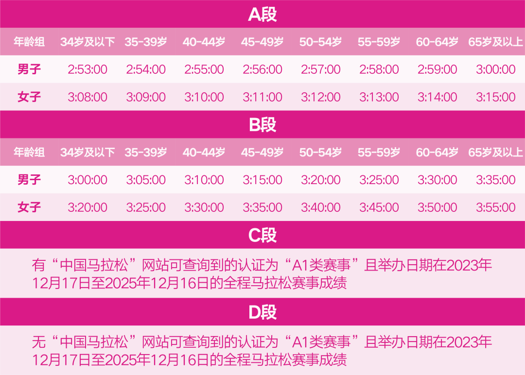 所有报名马拉松项目的选手,根据其「中国马拉松」网站可查询到的认证为「A1类赛事」且举办日期在2023年12月17日至2025年12月16日的赛事中,马拉松项目最好成绩达到如下成绩标准的分别进入各抽签段。