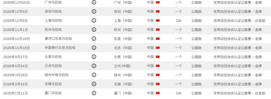 世界田联公布了2026年马拉松金标和白金标(部分)赛事举办时间!赛事举办时间如下: