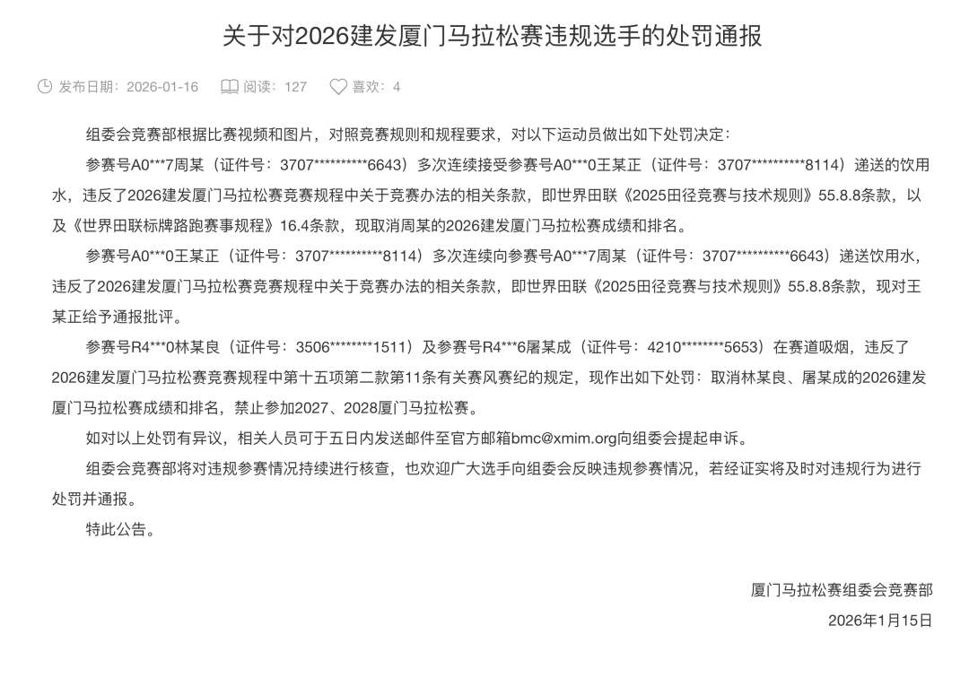 2026年厦门马拉松赛刚刚落下帷幕,作为全球知名的世界田联“白金标”赛事,厦马对赛风赛纪的严要求一直是行业标杆。1月15日,厦门马拉松赛组委会竞赛部正式发布了一则《处罚通报》,针对比赛中出现的违规行为开出了“罚单”。