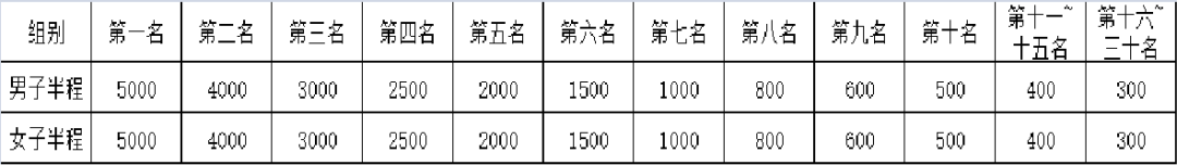 (一)半程马拉松项目名次奖:男、女前三十名的半程选手(按枪声成绩),分别获得奖金(人民币,单位:元)