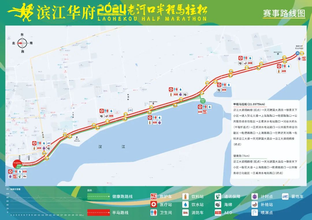 健康跑:沿江大道翔鹤楼(起点)→天河建国大酒店→御景天下小区→梨花大道→上海路路口→乾德路路口→公共服务综合功能区→王甫洲水电站路口(终点)
