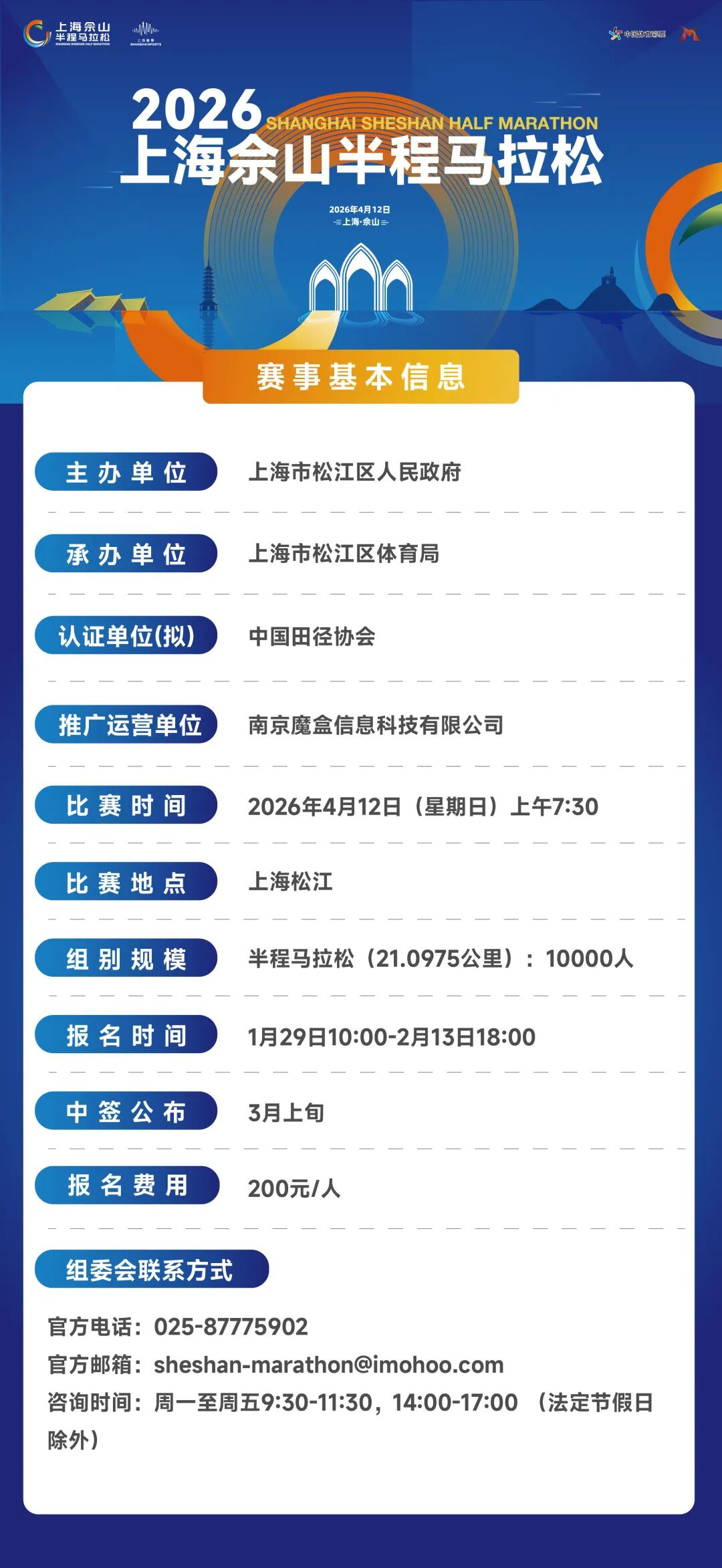 *赛事由上海市松江区人民政府主办,上海市松江区体育局承办,中国田径协会认证(拟),南京魔盒信息科技有限公司运营推广。