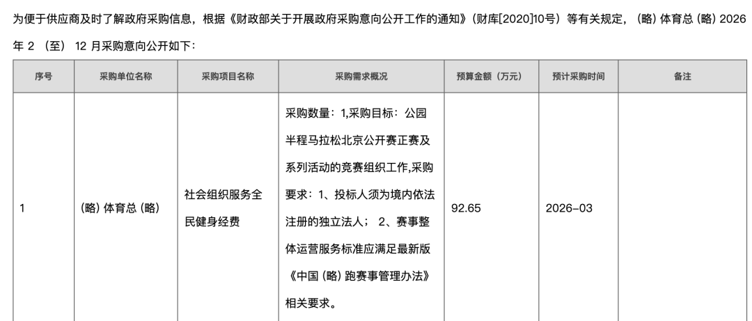 为了给广大跑友提供更高质量的赛事体验,北京市体育总会(本级)已正式发布2026年度的采购意向。这意味着,明年的赛事规划已经进入实质性筹备阶段!