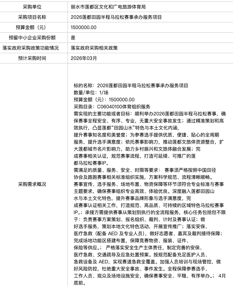 2026莲都田园半程马拉松招标信息: