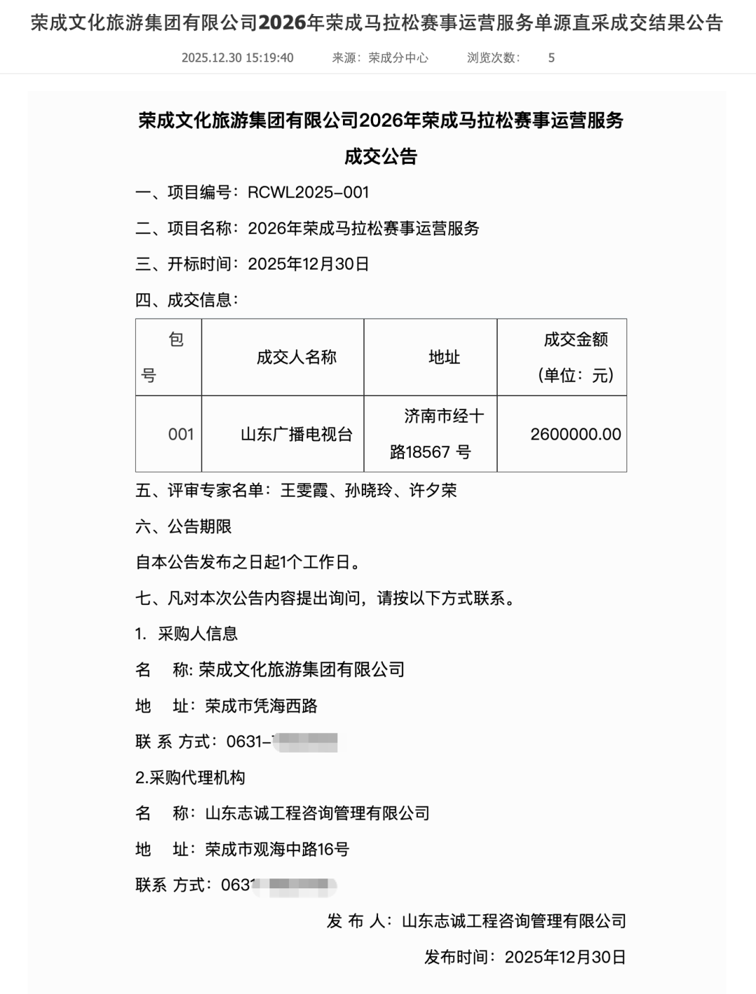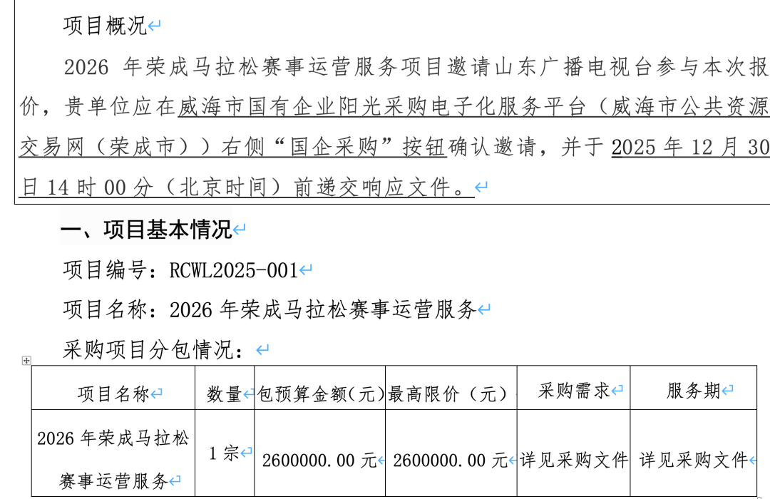 为“2026荣成马拉松”顺利开展,赛事运营单位需科学严谨、系统规范开展赛事筹备和竞赛组织工作,同时深度开发荣成人文和地域特色,展示荣成发展新成就。赛事将在网络平台进行全程直播,制定实施赛事宣传方案、市场开发方案,营造开闭幕式现场和赛道氛围等。赛事规模10000人,马拉松3000人、半程马拉松7000人。